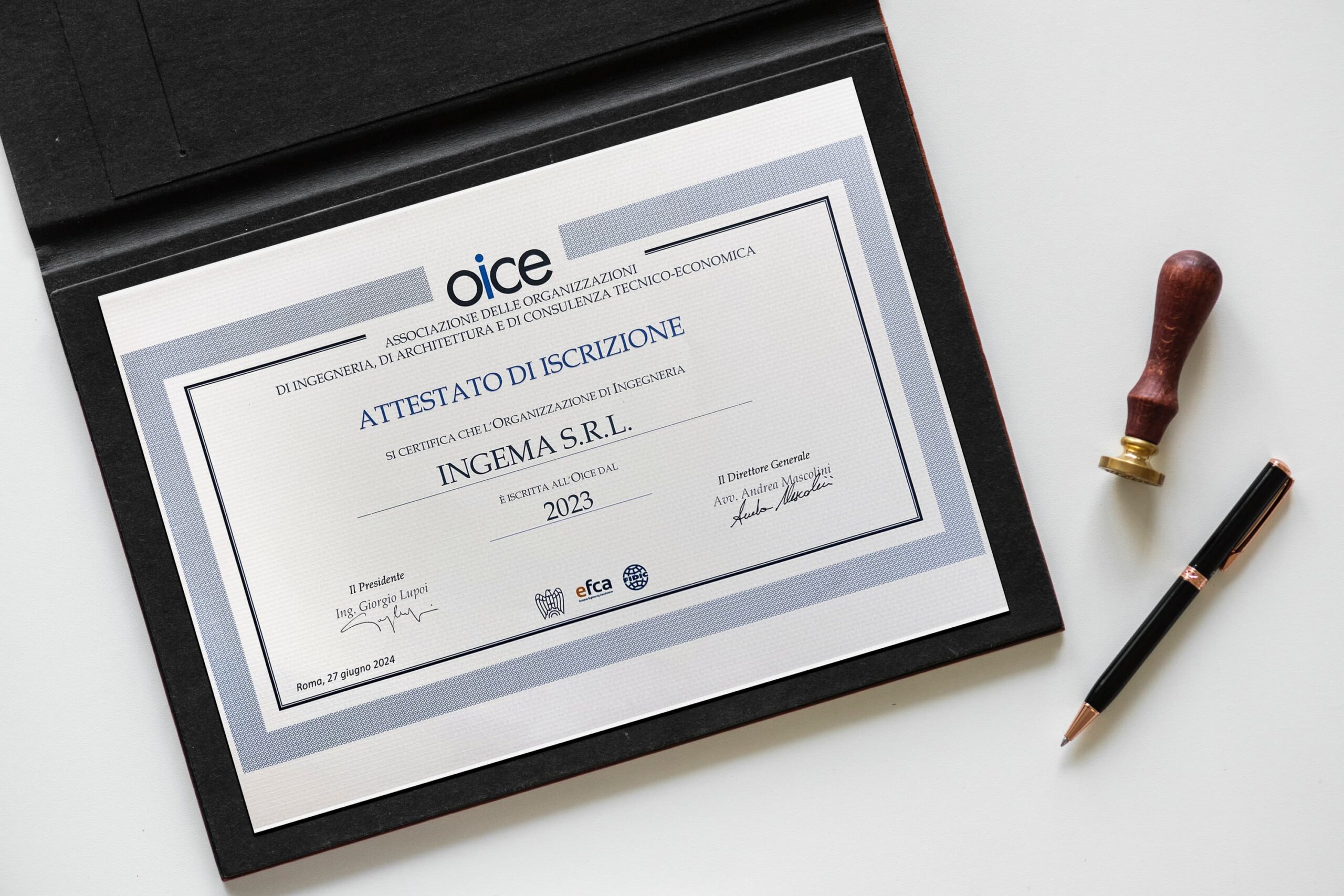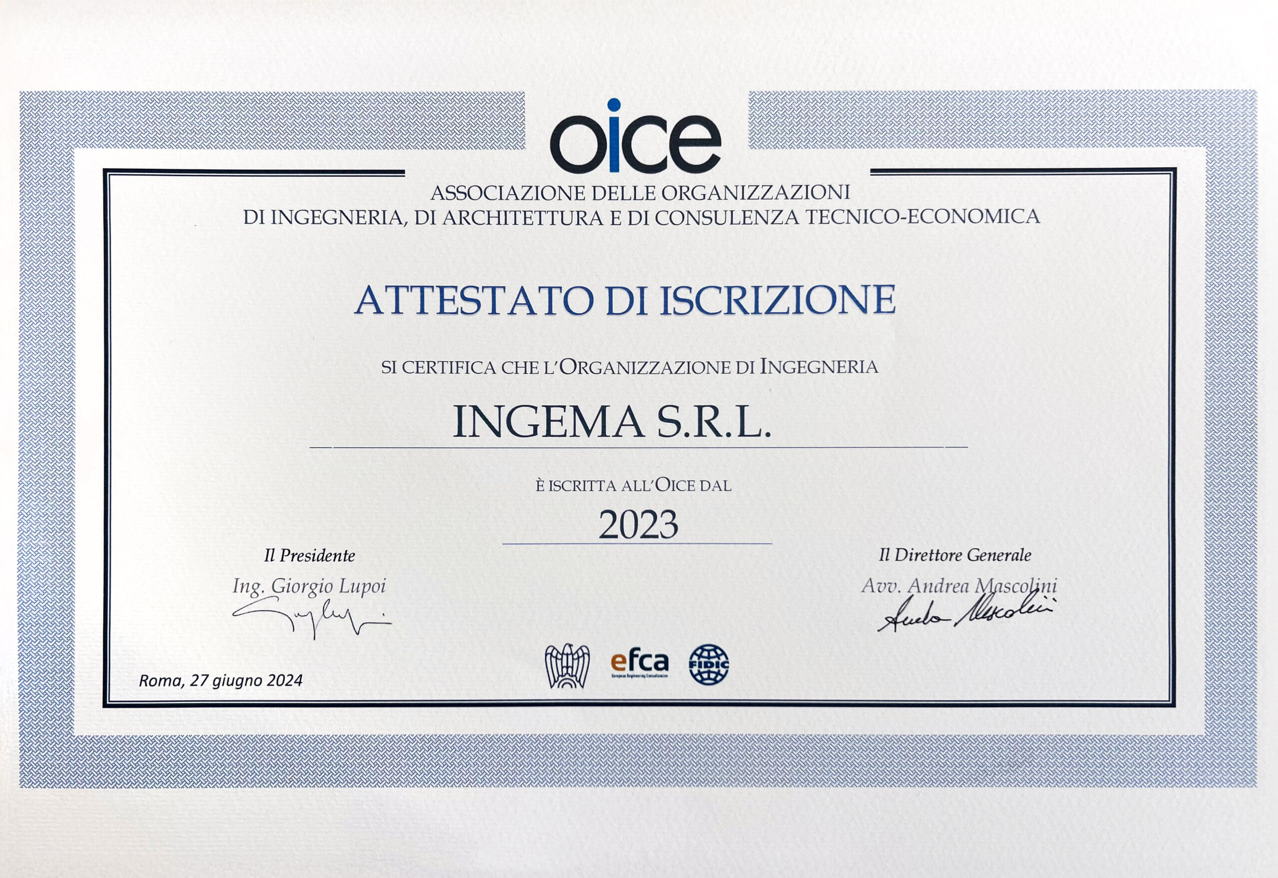 Dal 2024, Ingema Srl ha ulteriormente consolidato il proprio posizionamento nel panorama nazionale aderendo all’OICE, associazione di categoria del sistema confindustriale riconosciuta a livello istituzionale, che rappresenta e tutela in Italia il settore dell’ingegneria e dell’architettura organizzata dal 1965.