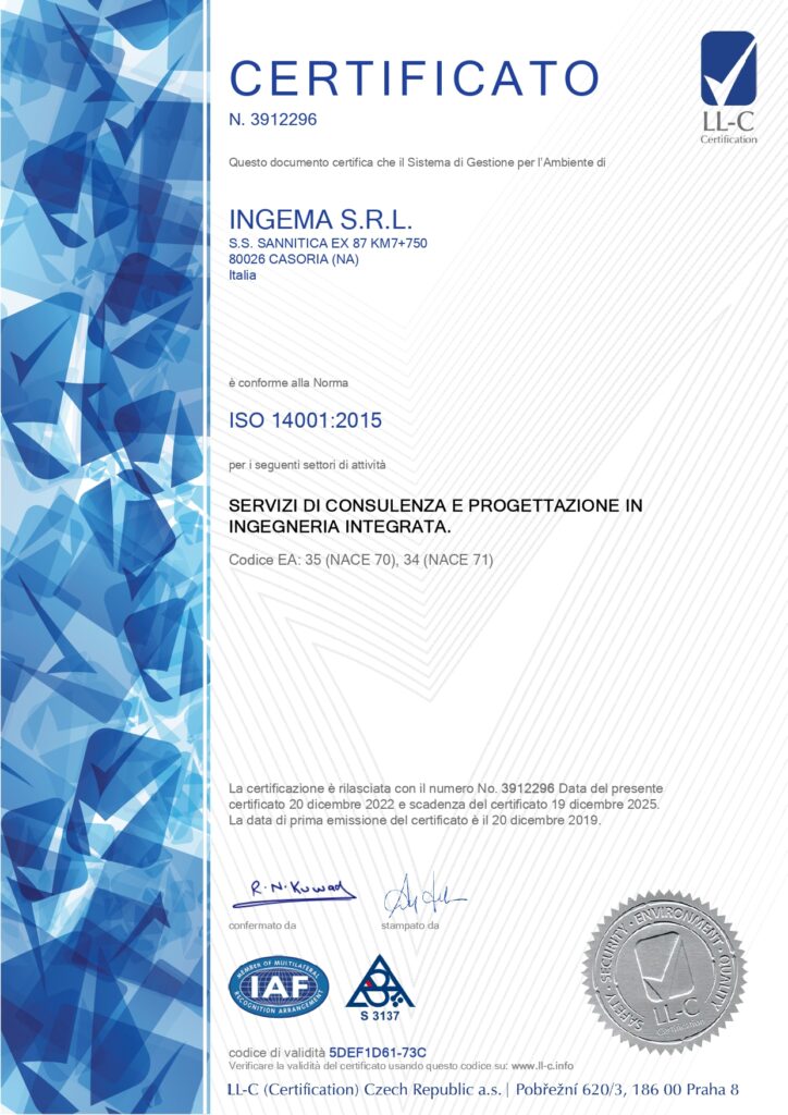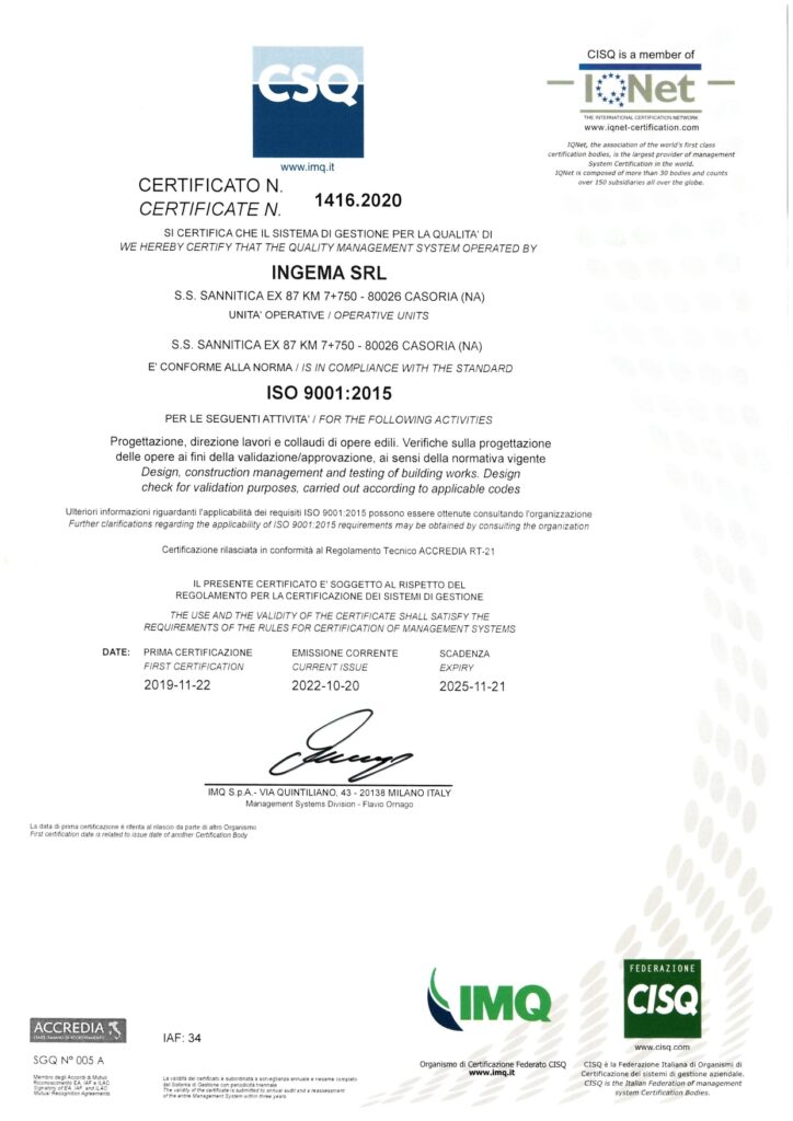 La INGEMA Srl opera adottando un sistema di gestione della qualità certificato secondo la norma ISO 9001:2015, ottenuto dall’ente CSQ (Certificato n. 1416.2020) e valido per i seguenti scopi: Progettazione, Direzione Lavori, Collaudi e Verifiche sulla progettazione delle opere ai fini della validazione.